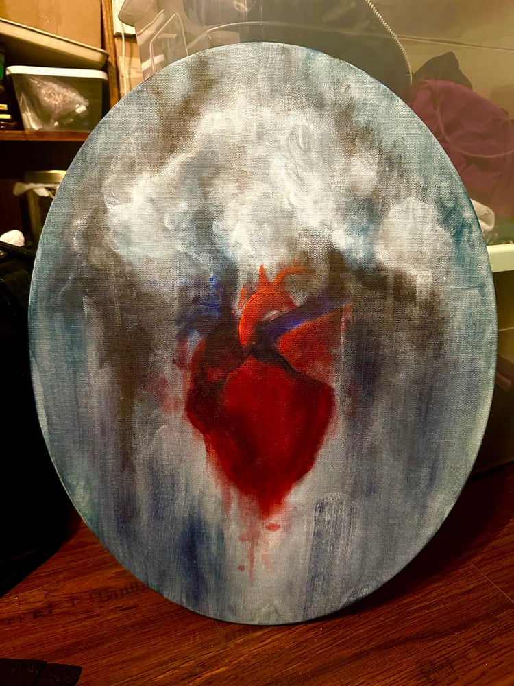 This will be an oval-shaped painting of my interpretation of the Three of Swords Tarot card. The last photo in this shows the original Rider Waite Smith illustration, the others are my unfinished interpretation of it.
